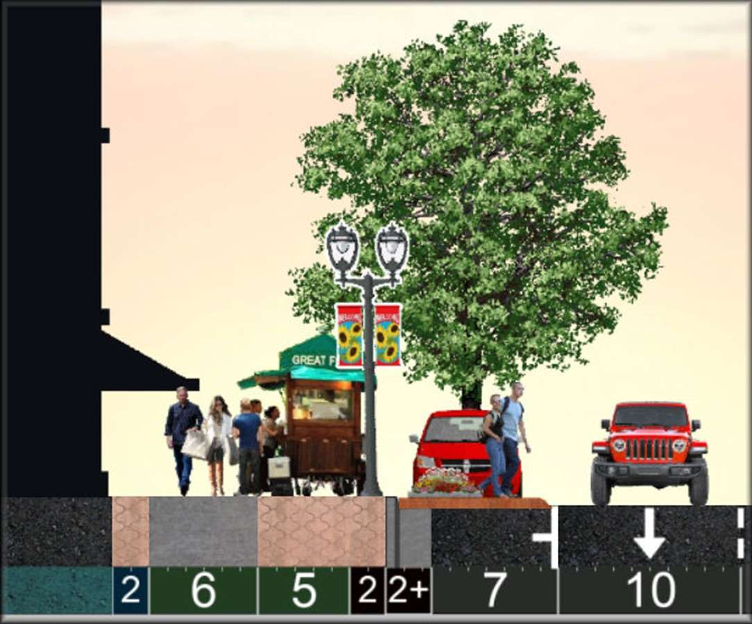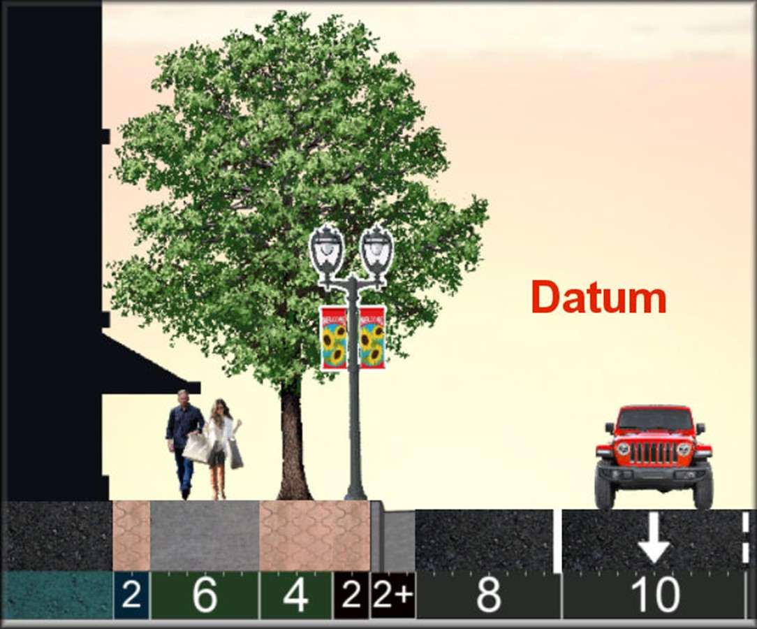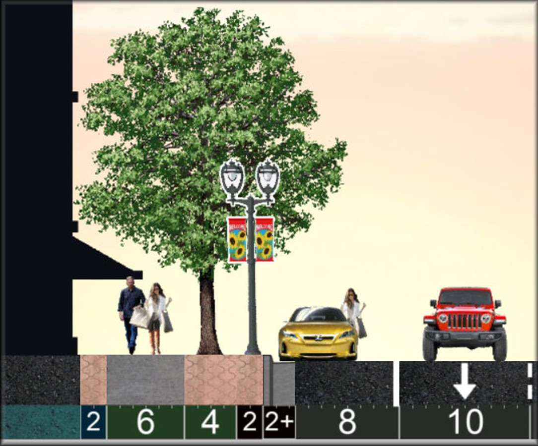 Many large, wide canopy trees due to Silva Cells or root trenches. Trees are relatively close to vehicles (< 10 ft to nearest lane).