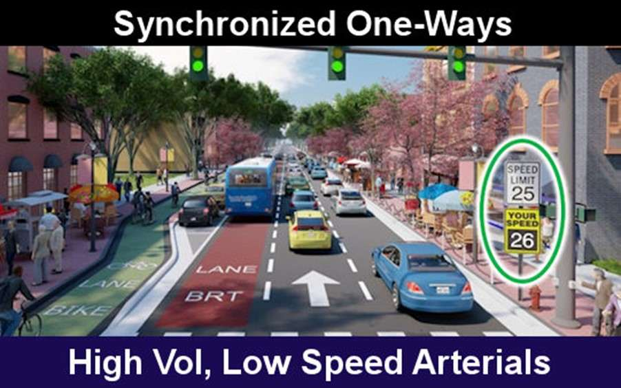 Traffic engineers are often reluctant to support traffic calming strategies, concerned that it will cause trips to take longer. However, it is often possible to reduce "cruise speeds" to safer levels, and also keep drive trips the same if not a little faster. The key is to reduce how long drivers are stuck at traffic signals.